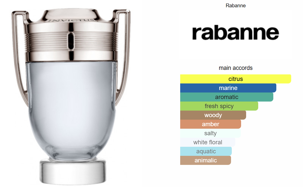 Invictus by Rabanne is a Woody Aquatic fragrance for men. Invictus was launched in 2013. Invictus was created by Veronique Nyberg, Anne Flipo, Olivier Polge and Dominique Ropion. Top notes are Sea Notes, Grapefruit and Mandarin Orange; middle notes are Bay Leaf and Jasmine; base notes are Ambergris, Guaiac Wood, Oakmoss and Patchouli.