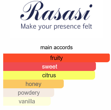 Royale by Rasasi is a Floral Fruity Gourmand fragrance for women. Top notes are Tangerine and Bergamot; middle notes are Red Berries and Fruity Notes; base notes are Honey, Vanilla, Sandalwood and Musk.