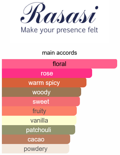 Maa Arwaak by Rasasi is a Floral Fruity Gourmand fragrance for women. Top notes are Cranberry, Floral Notes, Pink Pepper and Tamarind; middle notes are Rose, Cacao Pod, Violet and Coffee blossom; base notes are Vanilla, Patchouli and Massoia.